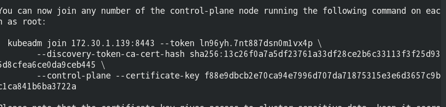 - sudo kubeadm init --control-plane-endpoint 172.30.1.139:8443 --pod-network-cidr=10.244.0.0/16 --upload-certs